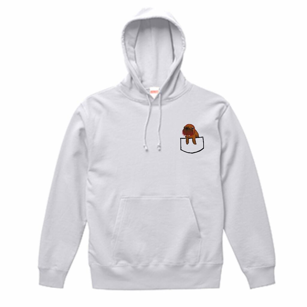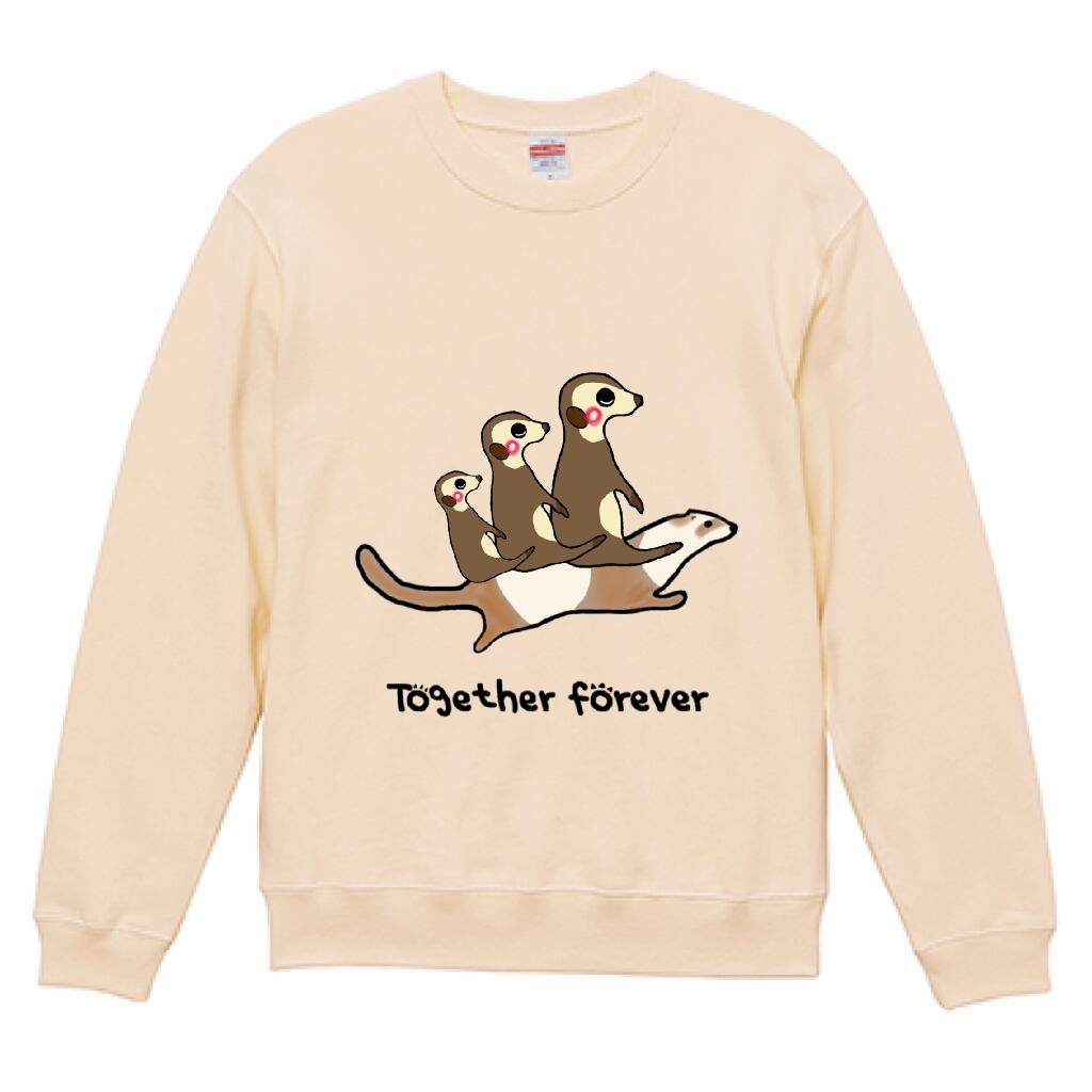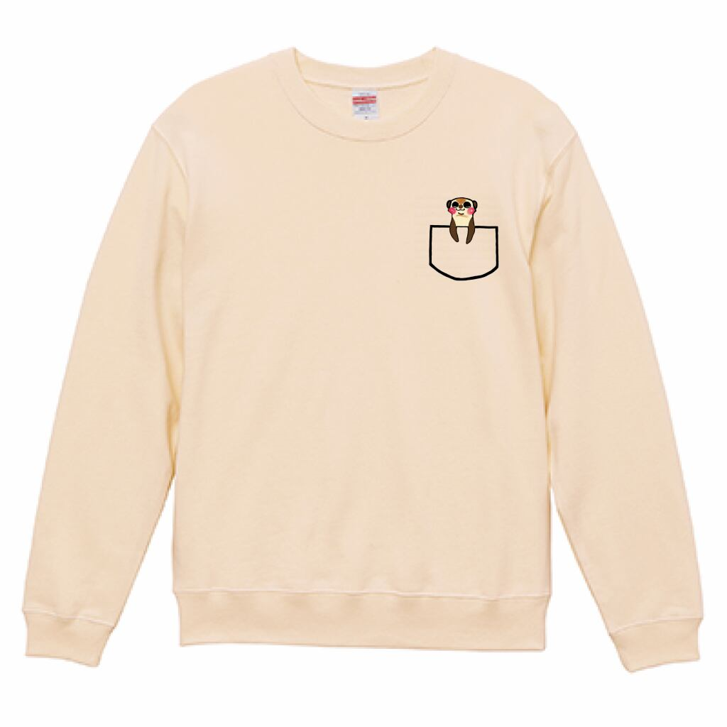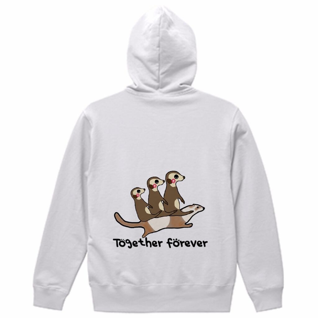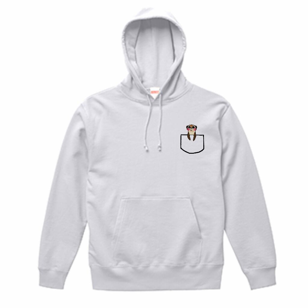 いつでもなかよしミーアとフェレットがバックプリントされ、胸にはポケットからミーアがひょっこり顔を出しているデザインがされたパーカーです。